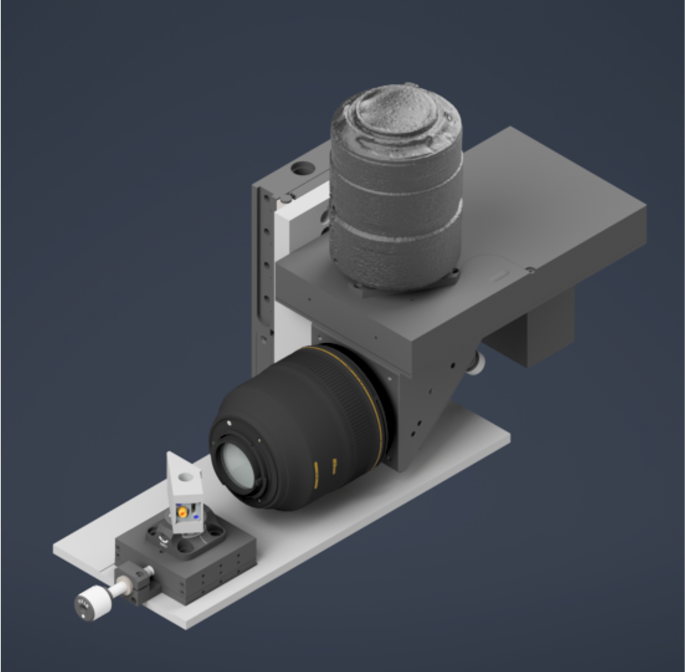 The entire detection module is mounted on a vertical translation stage so that the imaging plane can be adjusted relative to the specimen for focusing. At the camera end, a manual linear stage provides fine axial adjustment, and a rotary stage enables alignment of the camera sensor to the tilted image plane. These degrees of freedom are essential, since the optical performance of the system is particularly sensitive to the O2-to-camera distance and camera angle, as observed during the Zemax optimization.