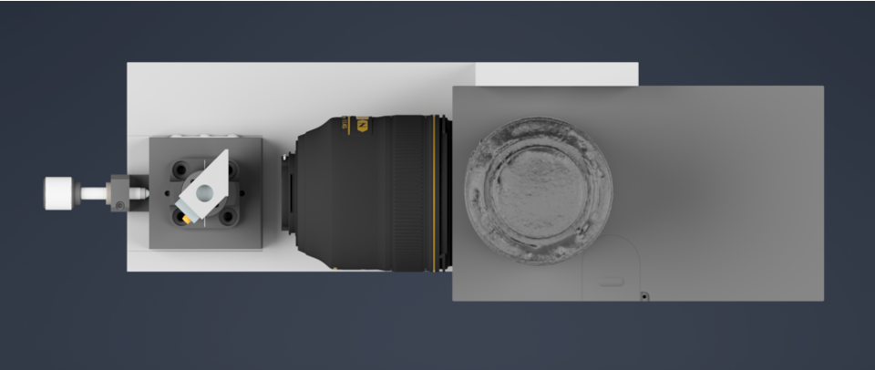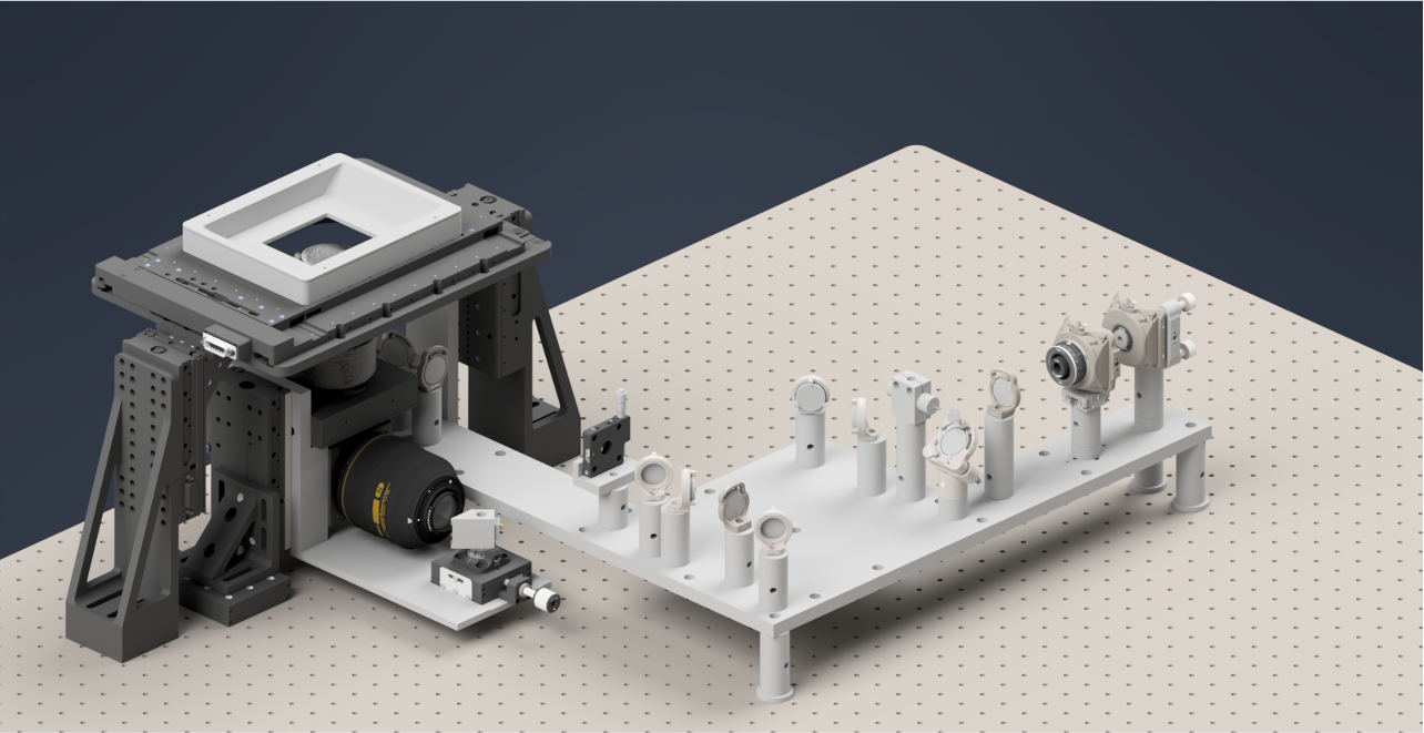 Near the end of the illumination path, the beam must leave the planar relay geometry and be directed upward toward the sample. This is achieved using a vertical inversion mirror followed by a final inclined mirror that launches the beam toward the specimen at approximately 20° relative to the stage. This final section is particularly important, as it represents the point where the optical relay geometry and the physical stage geometry intersect. The baseplate and mounting configuration must therefore preserve not only the lens spacings, but also the correct beam height and launch angle.