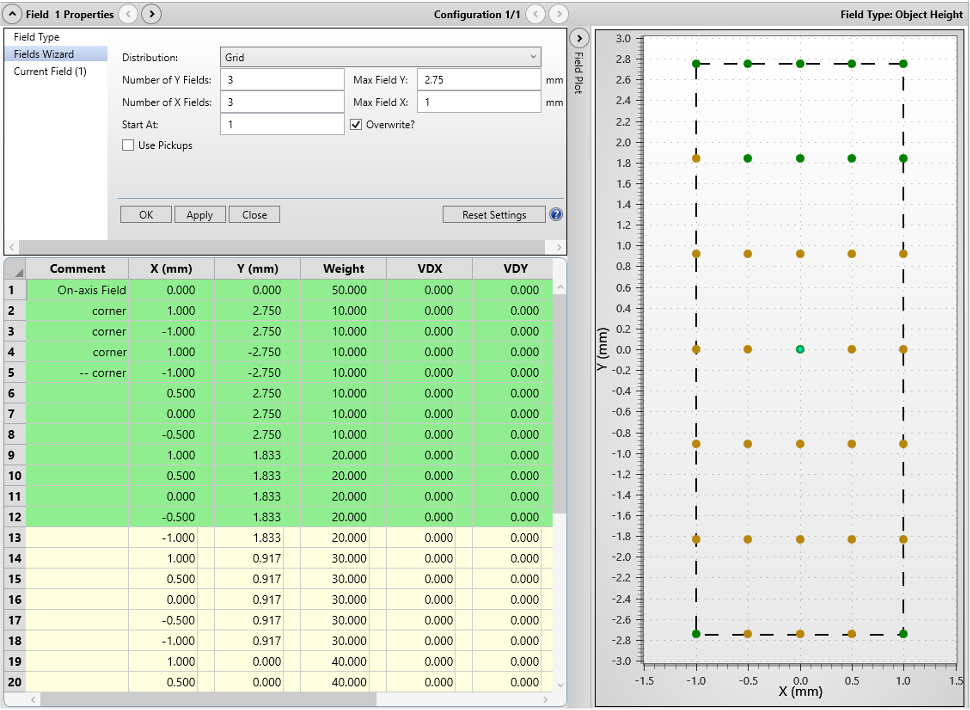 Figure 2: Settings and Plot of field points in Zemax on a 2D plane