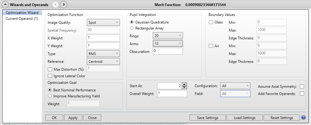 Figure 4: Optimization Wizard in Zemax. We are optimizng for the spot size of our detection path.